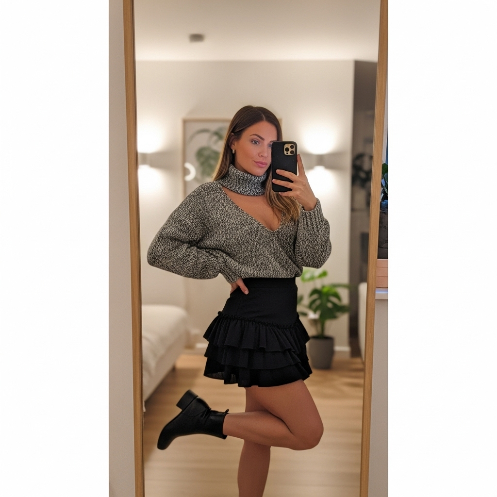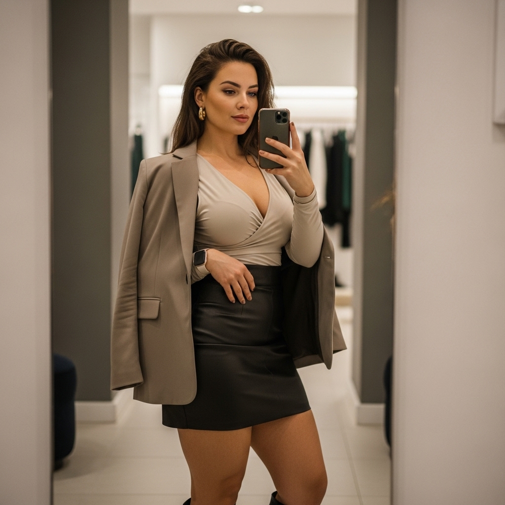 Combine edgy and refined with a leather skirt and oversized blazer. Add a tucked-in turtleneck and ankle boots for a balanced silhouette. This outfit is ideal for city walks or dinner nights — confident, bold, and timelessly stylish.