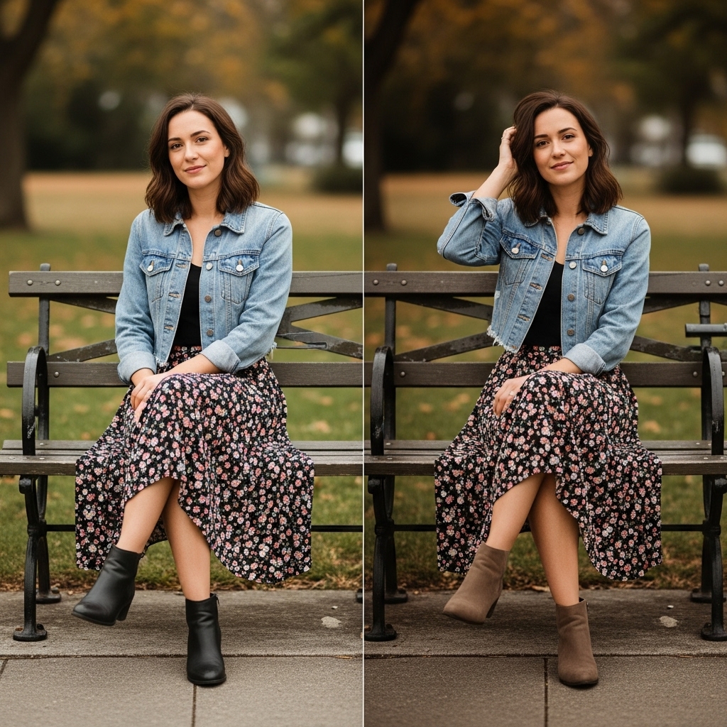 Don’t pack away your florals yet! Pair a floral midi skirt with a classic denim jacket to make it fall-friendly. Add boots and a neutral top to complete the look. It’s playful, colorful, and perfect for capturing that soft autumn aesthetic.