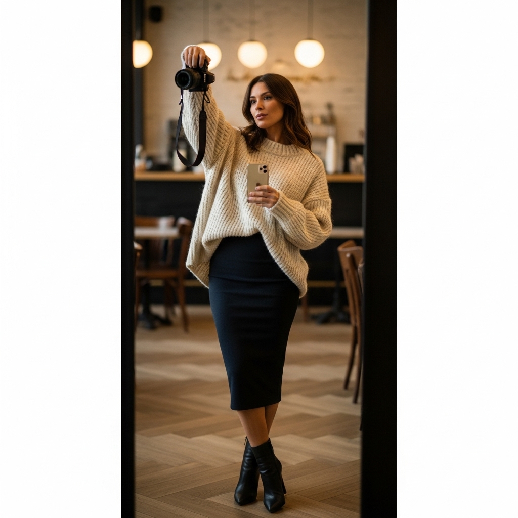 Blend professionalism with comfort by pairing a pencil skirt with a chunky oversized sweater. Tuck in just the front for shape and add heeled boots. This outfit looks polished but cozy — great for workdays or business-casual fall looks.