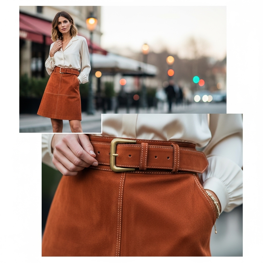 Suede skirts bring texture and luxury to your fall wardrobe. Pair with a long-sleeve chiffon blouse tucked in, plus a statement belt. Add heeled booties for height. This outfit is feminine and chic, striking the right balance between casual and sophisticated.