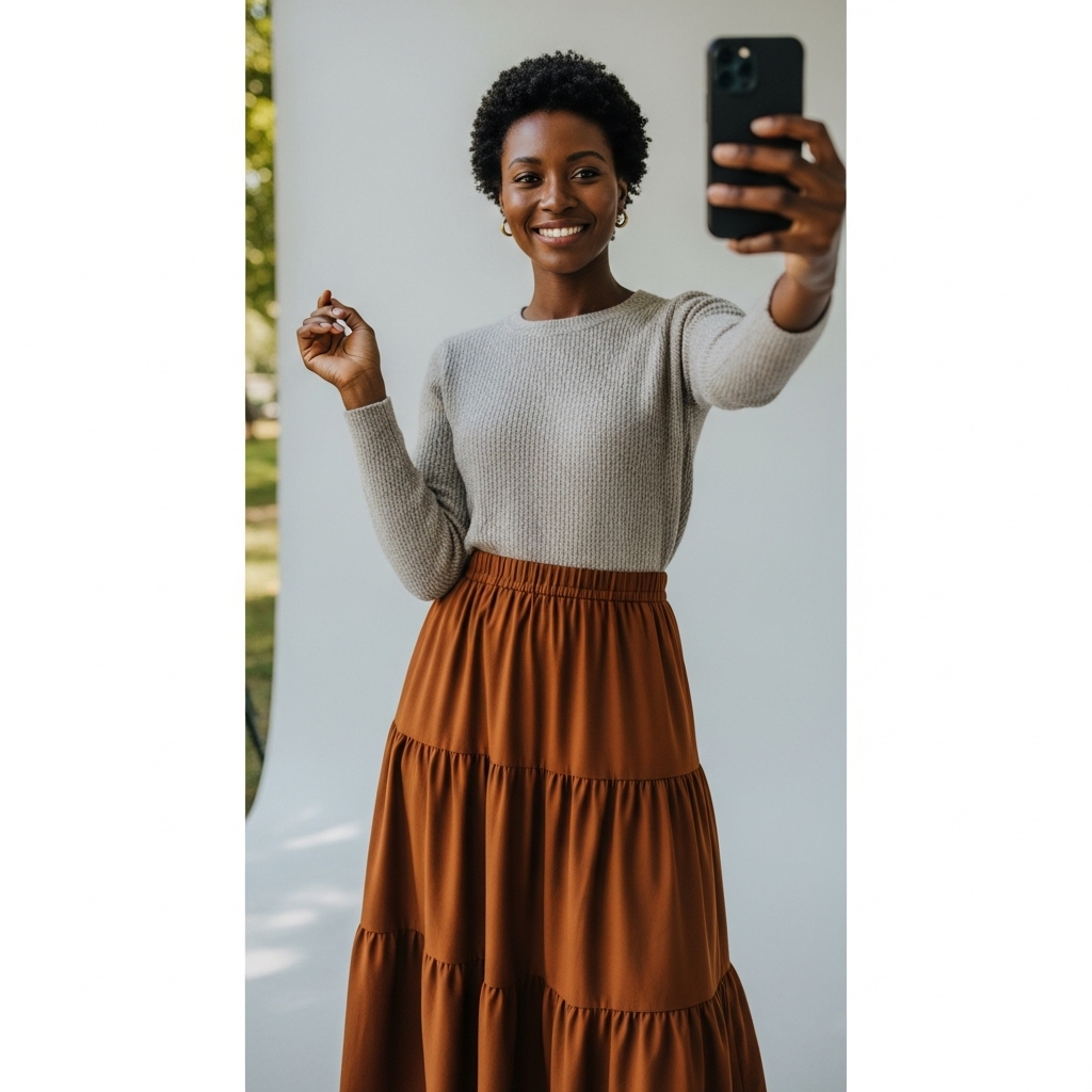 A tiered skirt adds playful volume to fall looks. Pair with a simple fitted sweater or long-sleeve top to balance proportions. Choose warm patterns like check or floral and add tall boots. This outfit has movement and charm — perfect for cozy outdoor shoots.