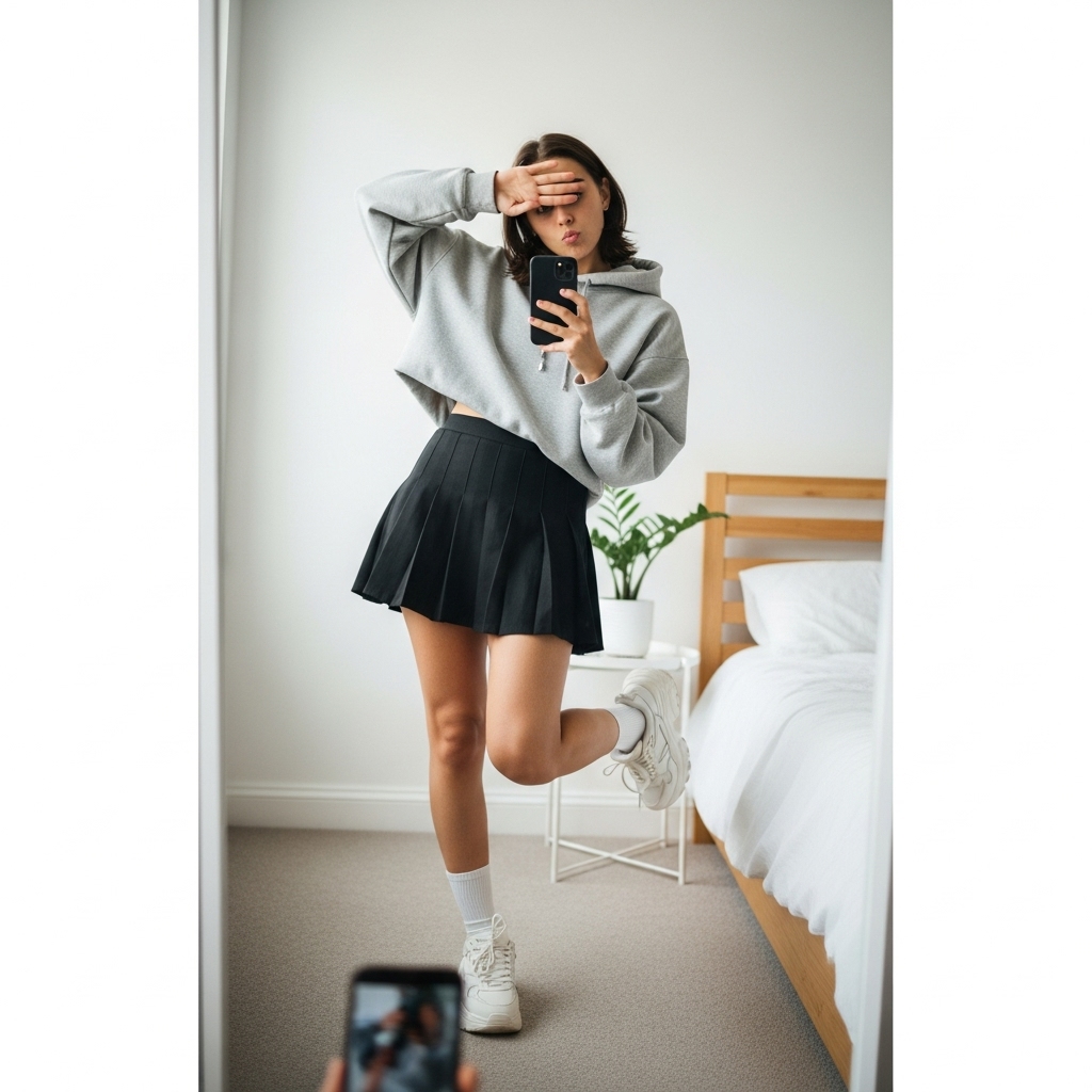 For a youthful streetwear vibe, wear a pleated mini skirt with an oversized hoodie. Add chunky sneakers or combat boots for edge. This comfy, cool outfit blends sporty and cute, making it great for casual fall days and fun mirror selfies.