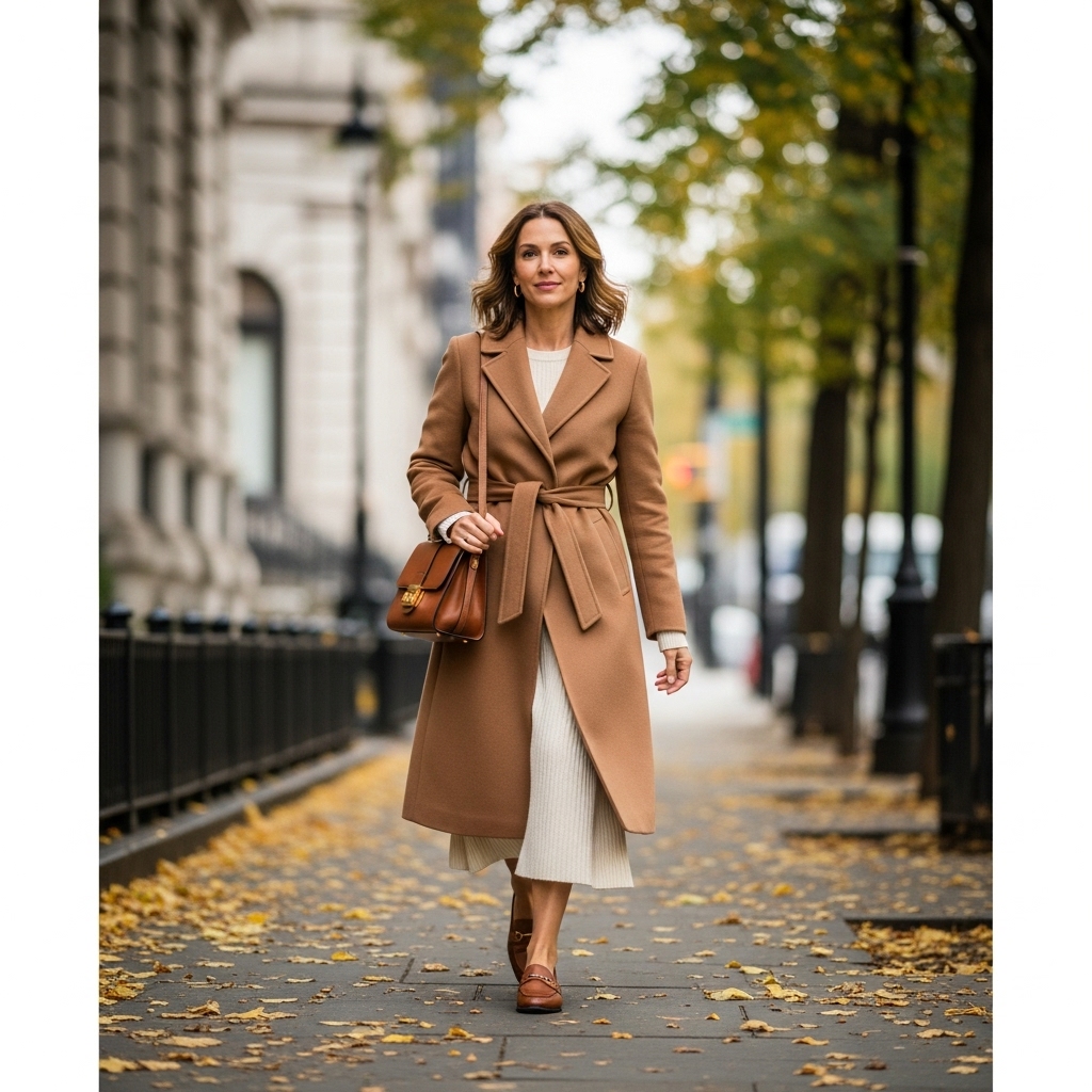 A knit midi skirt styled with a belted wool coat looks refined and cozy. Go for complementary tones like cream and camel for a luxe monochrome look. Add ankle boots or loafers for a polished finish. This outfit photographs beautifully for autumn cityscapes.