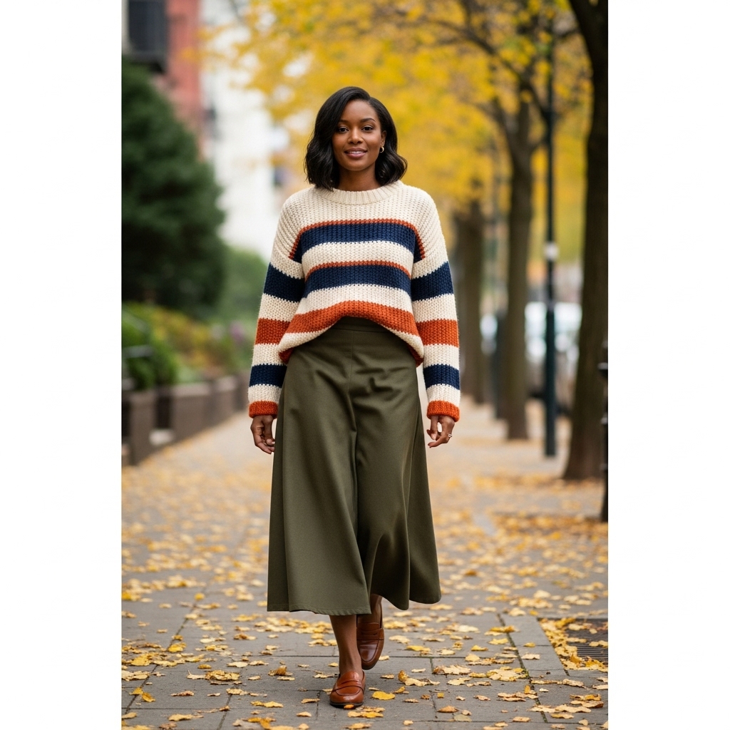 An A-line skirt with a striped sweater creates a timeless fall outfit. Choose neutral or pastel stripes for balance. Pair with brown loafers or boots and a shoulder bag. It’s simple, classic, and endlessly wearable — the definition of fall chic.