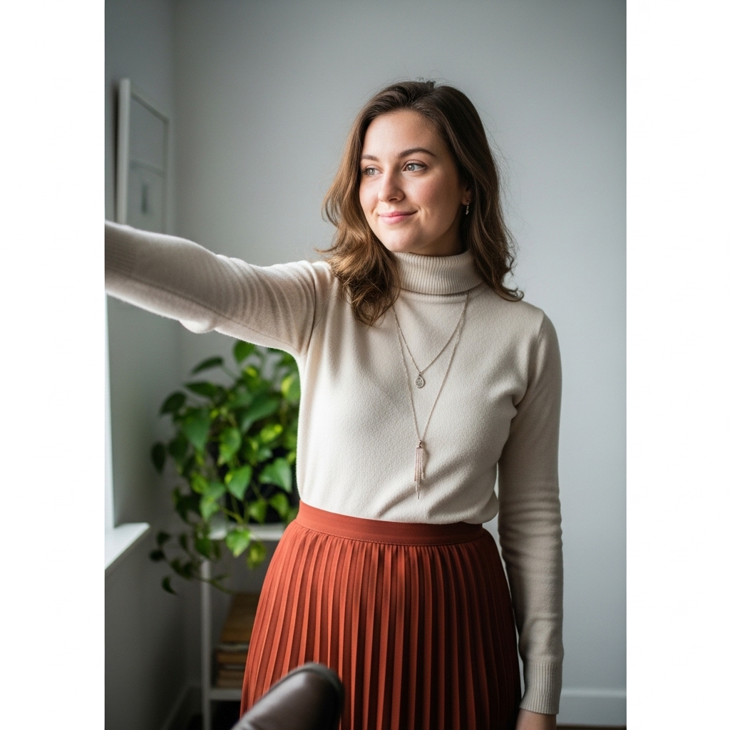 A pleated midi skirt paired with a fitted turtleneck gives off classy autumn vibes. Choose neutral or jewel tones for a seasonal look. Add heeled boots and a belt to define your waist. This timeless combo works for coffee dates, office days, or fall photo sessions.