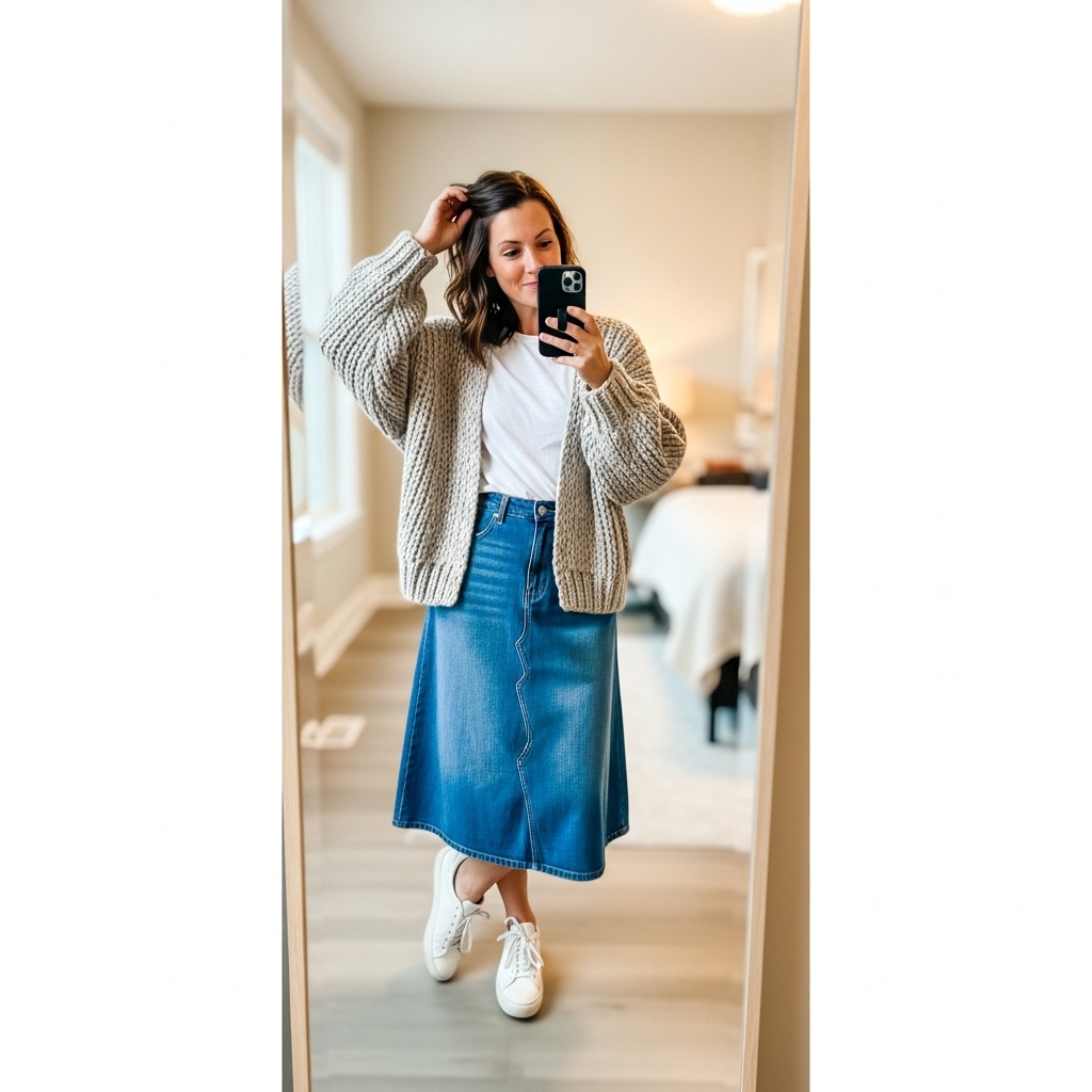 A denim skirt is a fall staple that pairs effortlessly with a chunky oversized cardigan. Wear a tucked-in tee underneath and add sneakers or ankle boots for a relaxed finish. The balance of textures gives your outfit a cozy yet casual charm — perfect for fall errands or casual outings.