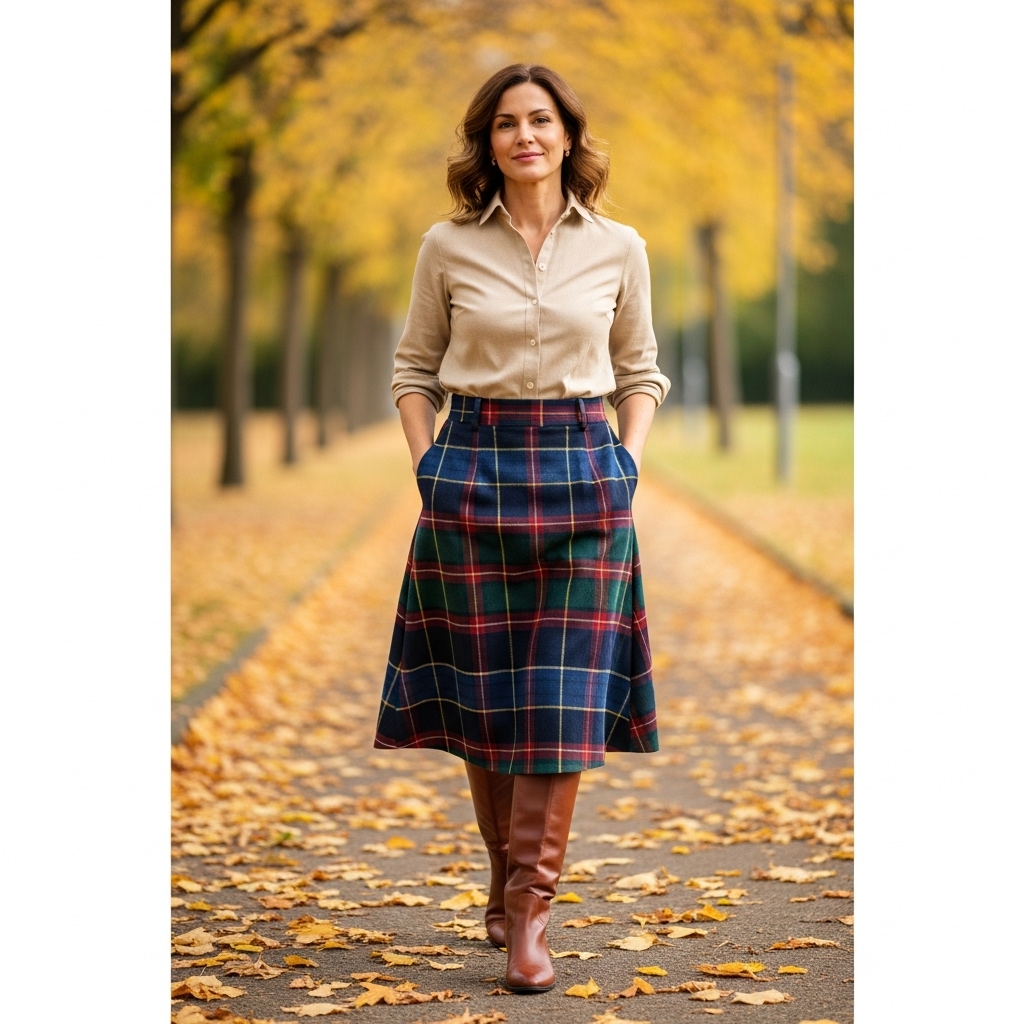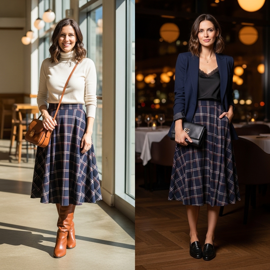 A plaid midi skirt paired with a structured blazer creates a classy, smart fall outfit. Wear it with a fitted turtleneck underneath and heeled loafers. This polished look transitions easily from work to dinner, keeping you chic and comfortable all day long.