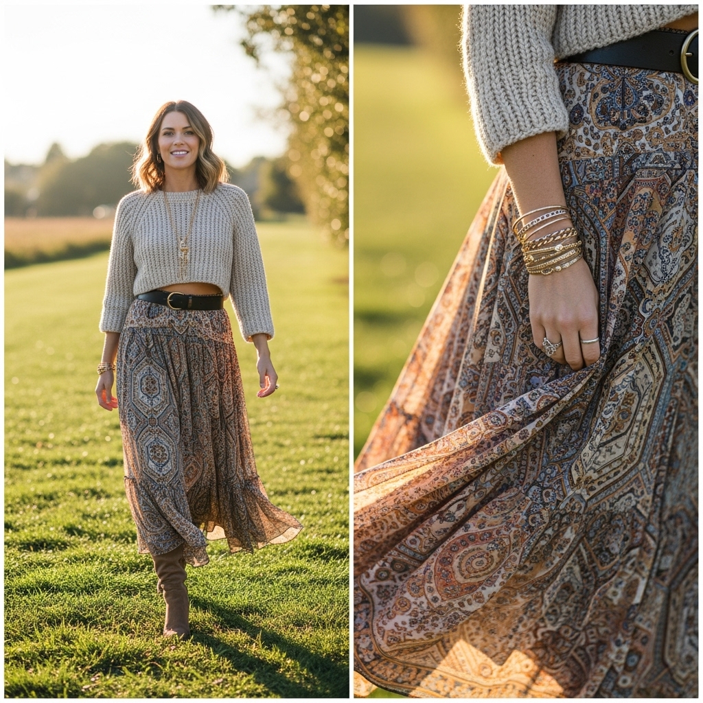 Mix flowy and fitted by pairing a maxi skirt with a cropped knit sweater. Choose warm prints like floral, rust, or brown. Add a belt to accentuate your waist and pair with suede boots. It’s a comfy, feminine look that moves beautifully in fall breezes.