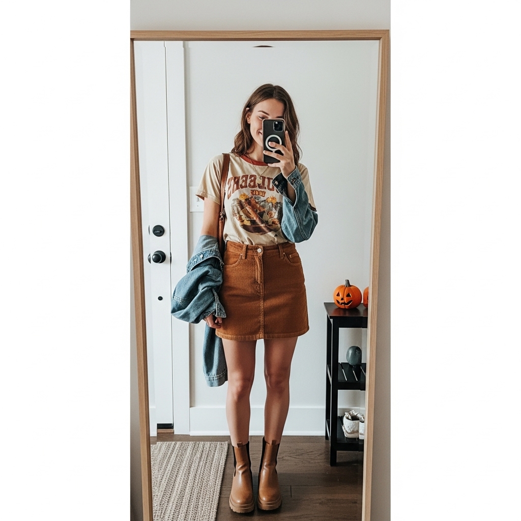 Corduroy is the ultimate fall fabric! Combine a corduroy mini with a vintage-style graphic tee for an effortlessly cool vibe. Throw on a denim jacket and booties to complete the look. It’s casual, youthful, and full of retro charm that’s perfect for Pinterest-style photos.