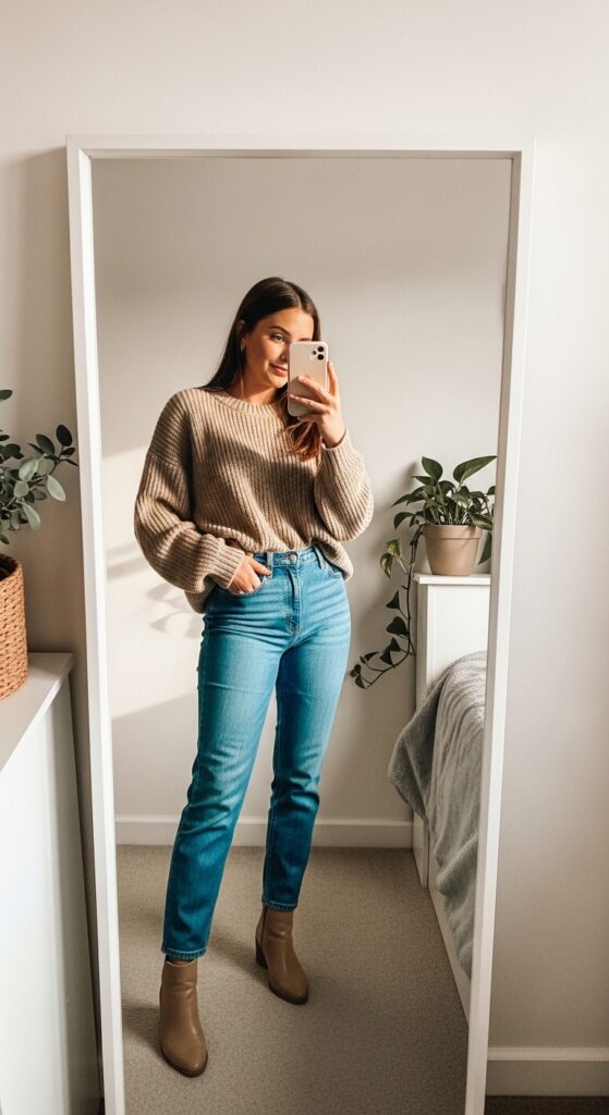Nothing says fall like oversized sweaters paired with classic blue jeans. This cozy look works for coffee runs, study sessions, or lazy weekends. Add ankle boots or white sneakers for a casual finish. Opt for neutral tones like beige, cream, or gray to keep it chic. Accessorize with a chunky scarf and a crossbody bag for that perfect Pinterest-worthy vibe.