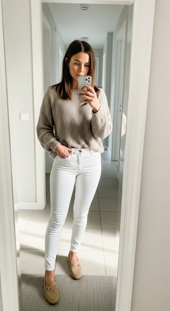 Don’t pack away your white jeans just yet—they look stunning in fall with cozy neutral sweaters. Beige, camel, and oatmeal tones complement crisp white denim beautifully. Pair with tan boots or loafers to keep the look cohesive. This outfit feels refreshing and stands out among typical fall colors, perfect for brunch or casual outings. Add minimal gold jewelry for warmth.