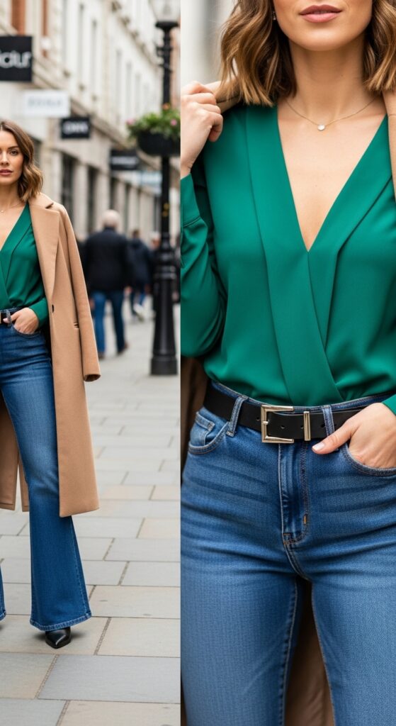 Flared jeans styled with slim-fit turtlenecks create a flattering, retro-inspired fall outfit. Add a belt to emphasize your waist and platform boots for height. Neutral or jewel-toned turtlenecks make the look versatile. Throw on a long coat for extra warmth. This silhouette elongates your legs while maintaining a chic fall vibe, ideal for dinners or stylish daytime outings.