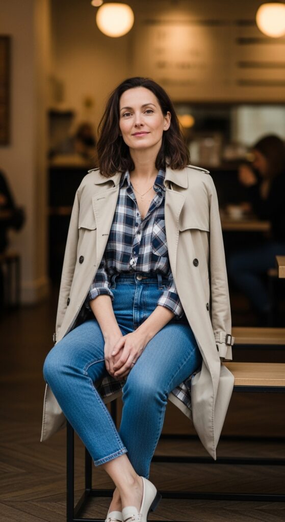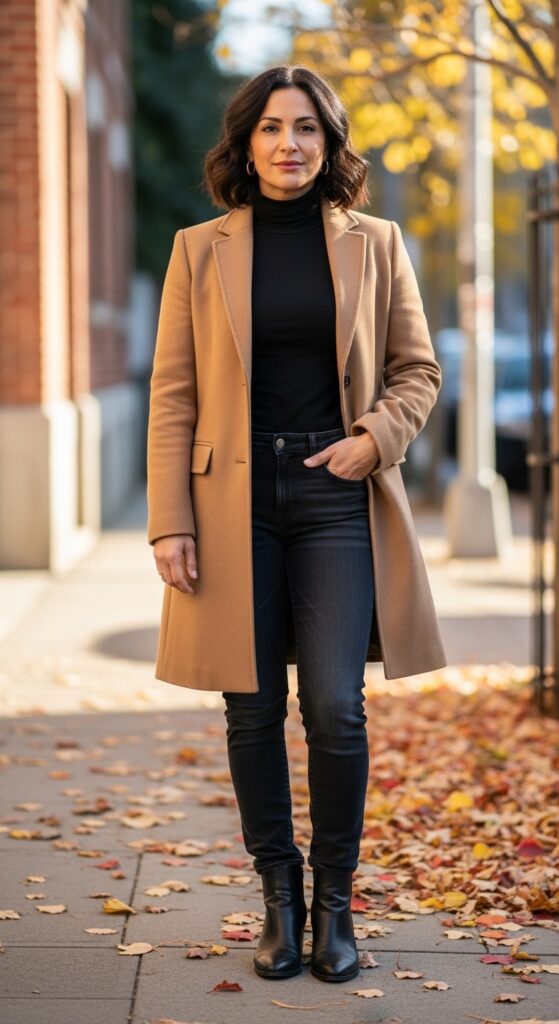 Dark wash jeans paired with long coats create a sleek, sophisticated fall outfit. Opt for wool or trench-style coats in camel, navy, or black. Add ankle boots or heeled loafers for polish. A simple turtleneck underneath keeps you warm while maintaining elegance. This look is ideal for city walks, dinner outings, or professional settings during autumn.