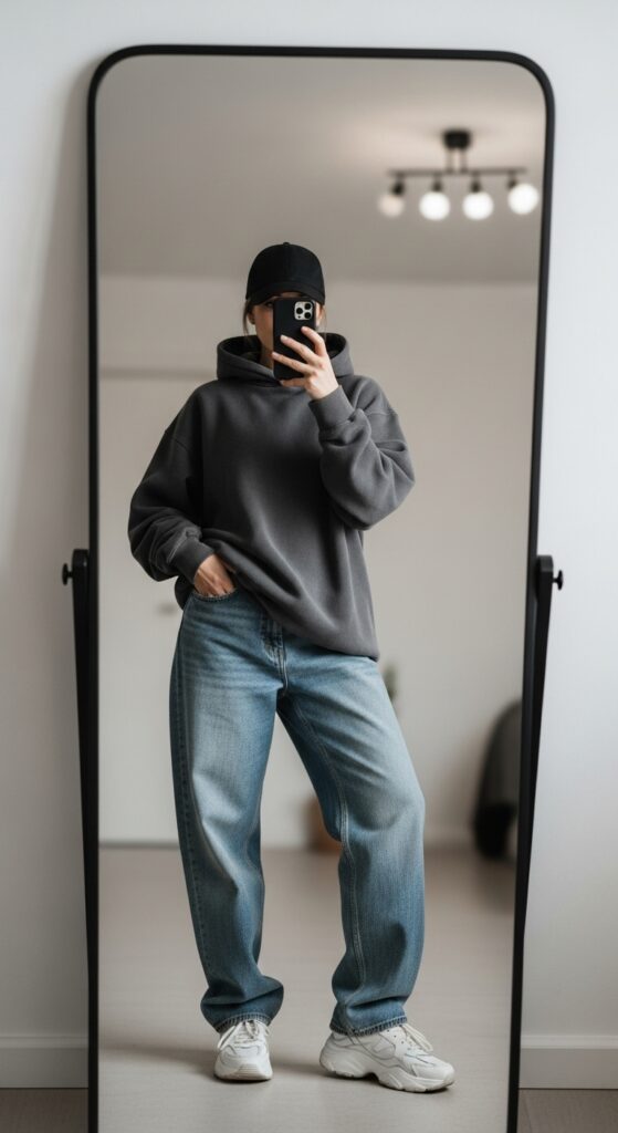 Baggy jeans styled with oversized hoodies are the ultimate cozy fall outfit. Pair with chunky sneakers or combat boots for a street-style edge. Add a baseball cap or beanie for personality. Neutral or muted hoodies blend well with denim for effortless layering. This casual combo is perfect for travel, study days, or laid-back weekends without compromising on comfort.