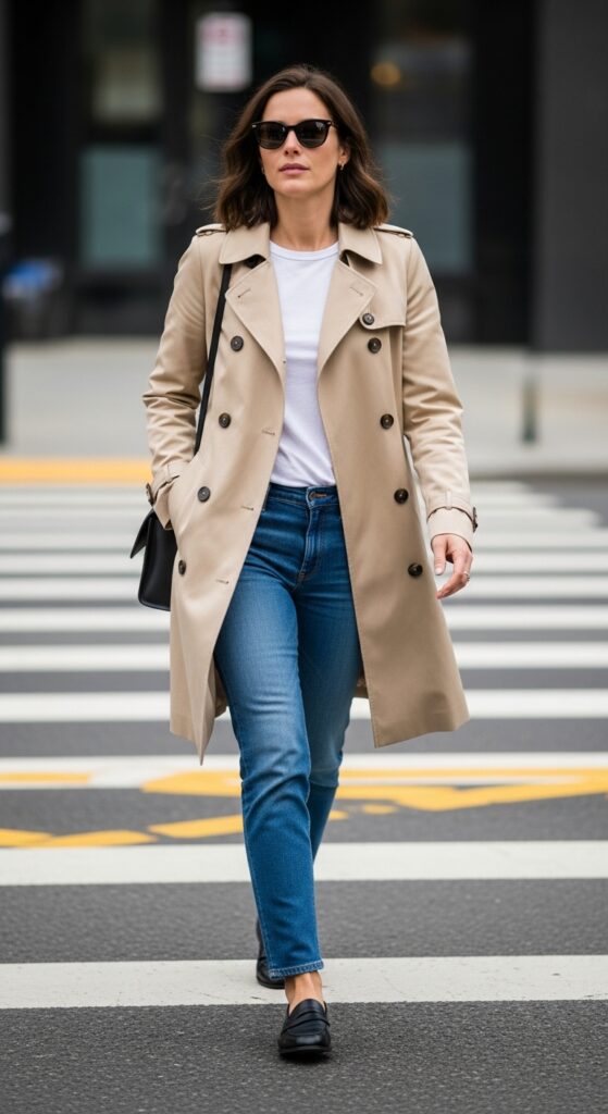 A timeless combo: classic blue jeans with trench coats. Perfect for rainy fall days, this outfit looks chic with loafers or ankle boots. Layer with lightweight knits or button-down shirts underneath. Neutral trench coats like beige or khaki keep the look versatile. Add a sleek handbag and subtle jewelry to elevate this everyday fall uniform into a Pinterest favorite.