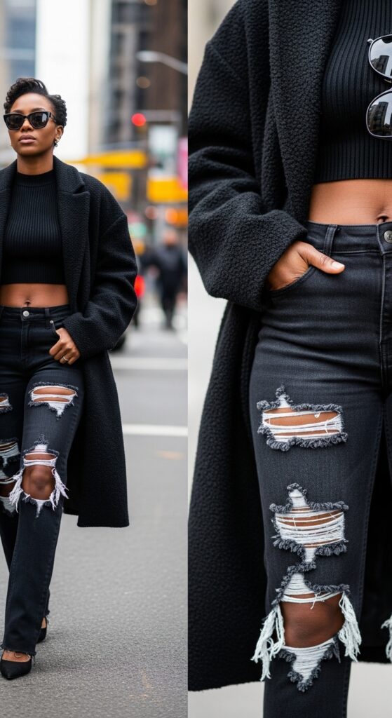 Distressed black jeans paired with oversized coats create an edgy yet polished fall outfit. Neutral coats in camel, gray, or black enhance the contrast. Add combat boots or sleek sneakers to complete the look. A scarf or beanie keeps you cozy while maintaining street-style flair. This combination is ideal for chilly days when comfort and style go hand in hand.