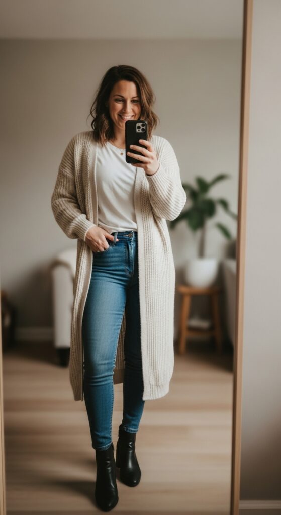 Skinny jeans styled with long cardigans create a streamlined fall outfit. Neutral cardigans in cream or beige pair beautifully with dark denim. Add ankle boots or loafers for polish. Layer with a camisole or fitted tee underneath for balance. This look is cozy yet chic, perfect for errands, study sessions, or casual work settings in autumn.