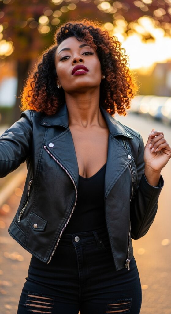 For an edgy fall aesthetic, pair sleek black jeans with a leather jacket. This combo is timeless and versatile, ideal for night outs or city strolls. Go for a fitted turtleneck underneath for warmth and style. Finish with heeled boots or combat boots to add character. Minimal silver jewelry elevates the look without overpowering it, making it effortlessly stylish and bold.