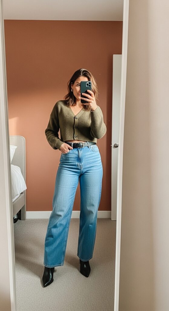 Wide-leg jeans are trending, and pairing them with a cropped cardigan creates a balanced silhouette. Choose earthy colors like olive, brown, or rust for that true fall vibe. A simple belt enhances your waistline, while heeled boots add length to your legs. This outfit is perfect for brunch dates or casual outings while keeping you warm and trendy.