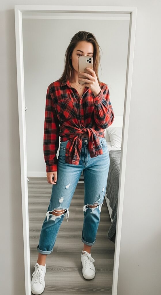 Distressed jeans and plaid shirts are perfect for a laid-back fall vibe. Add a denim or leather jacket on cooler days. This casual outfit is ideal for pumpkin patch visits or casual hangouts. Pair with white sneakers or ankle boots, and roll up your sleeves for extra flair. To elevate the look, accessorize with layered necklaces and a beanie hat.