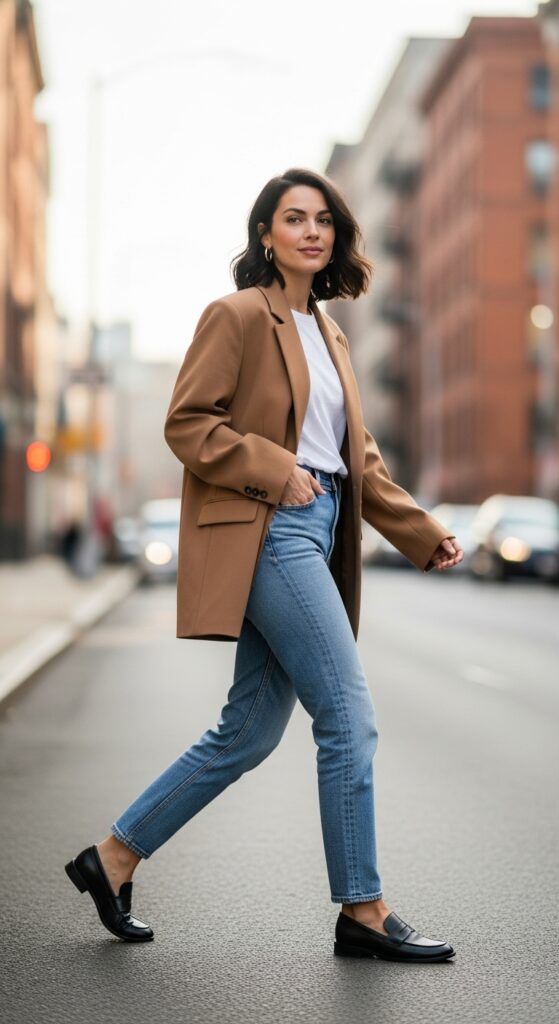 Straight-leg jeans with an oversized blazer create a chic, city-ready outfit. Add a basic tee or turtleneck underneath for layers. Neutral-toned blazers make the look versatile, while patterned ones add a bold statement. Pair with loafers or pointed-toe boots for polish. This outfit balances casual denim with smart tailoring, perfect for office days or classy brunches.