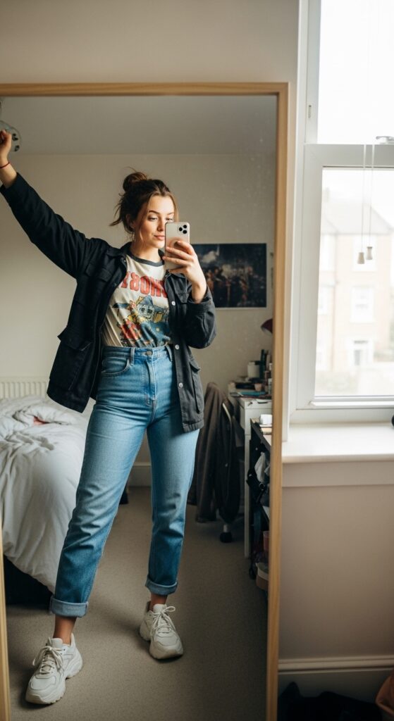 Mom jeans and graphic tees are timeless for casual fall days. Layer with a cozy cardigan or a utility jacket for warmth. Finish with white sneakers or chunky boots for an effortless vibe. This outfit is perfect for running errands, coffee dates, or relaxed evenings. Play with accessories like hoop earrings, crossbody bags, or caps to personalize your look.