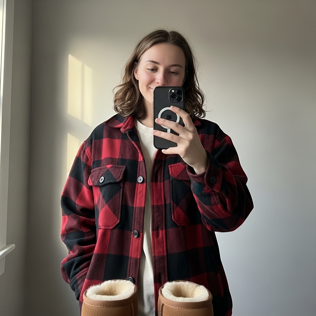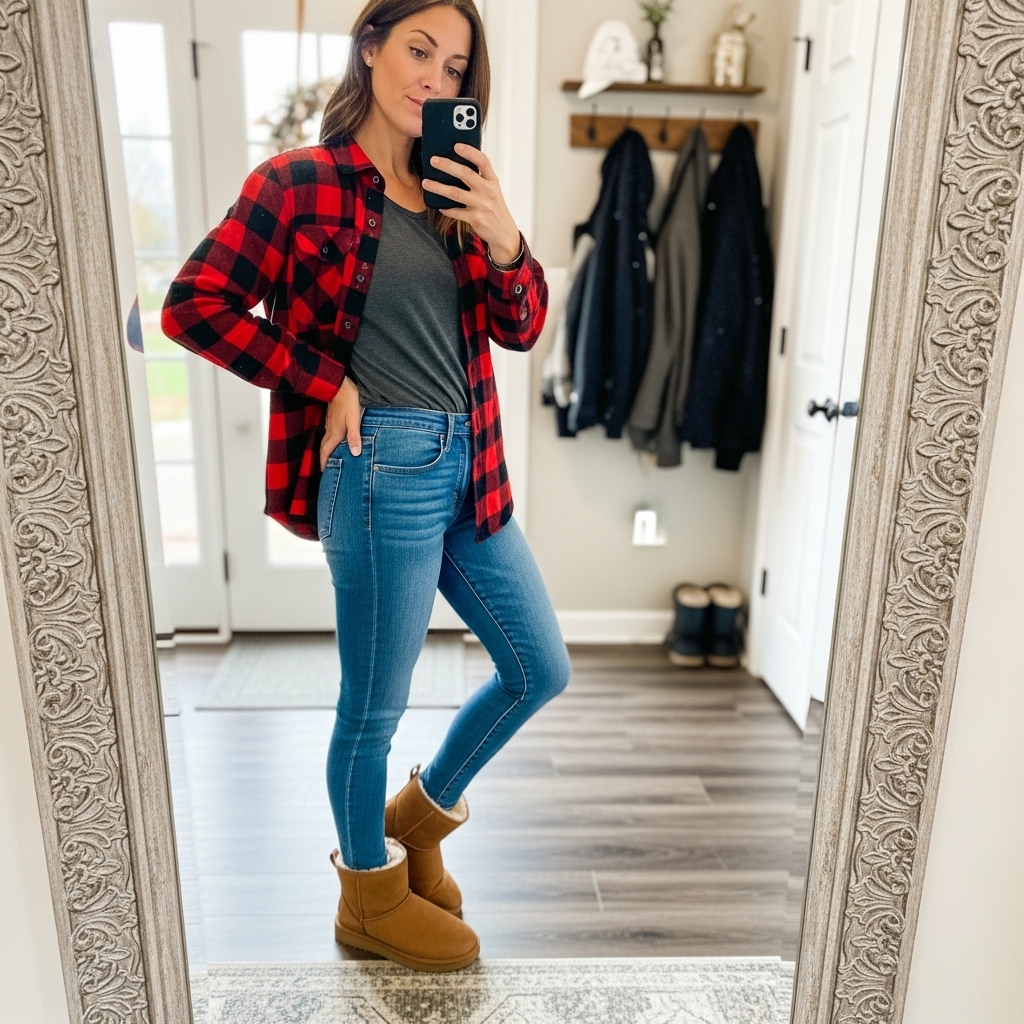 Plaid shackets paired with Uggs deliver the ultimate autumn aesthetic. The structured layering piece balances the softness of Uggs, making it both cozy and on-trend. Style with skinny jeans or faux leather leggings to add contrast. Choose oversized plaid patterns for a bold look, or neutral tones for subtle sophistication. This is the perfect outfit for casual outings or seasonal photo moments.