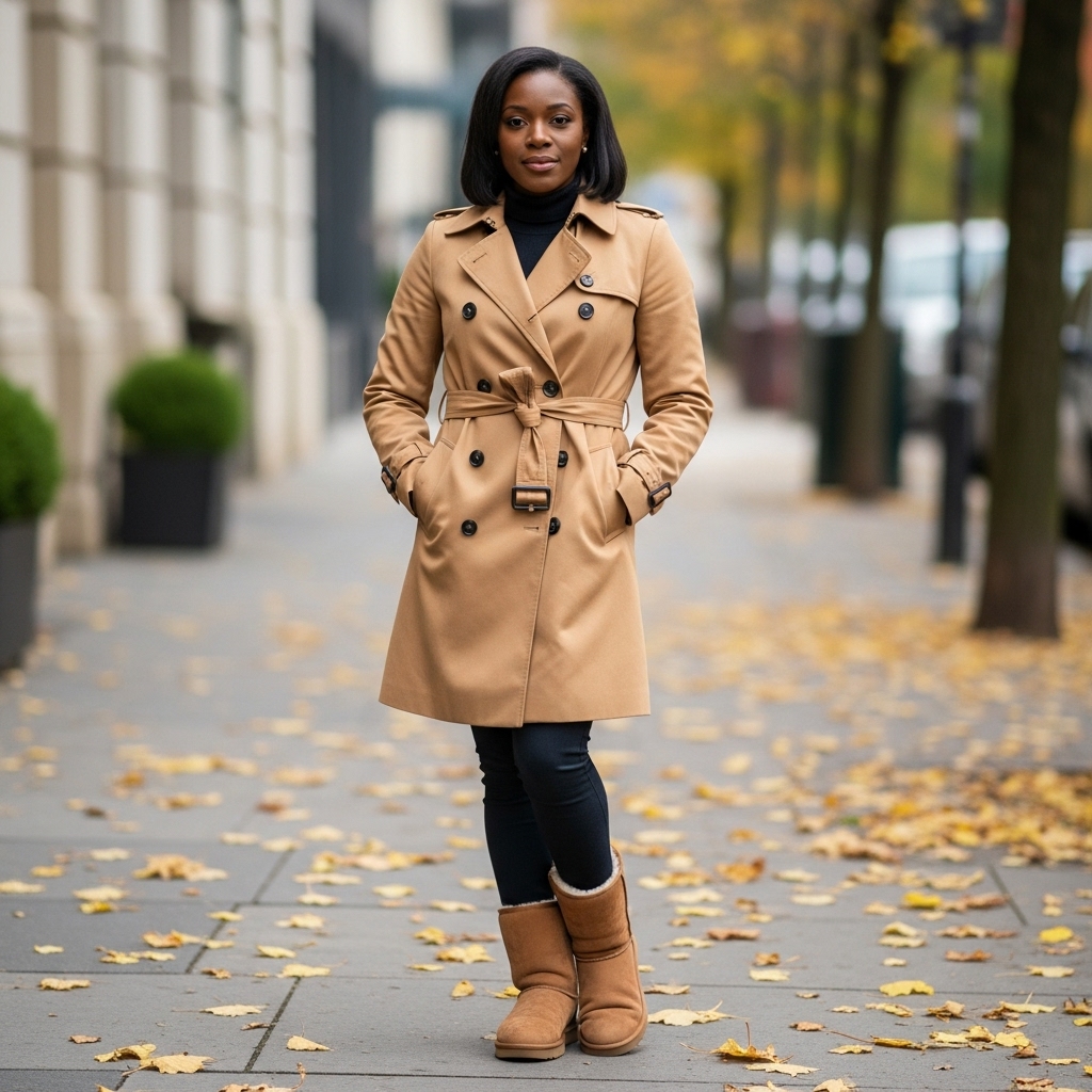 Mixing a trench coat with Uggs offers a sophisticated twist on casual footwear. The contrast between polished outerwear and cozy boots creates a balanced, fashion-forward outfit. Pair with fitted jeans or leggings to streamline the look. Choose classic camel or beige trenches for timeless appeal. This unexpected combo is perfect for city strolls, giving you warmth and effortless style in one package.