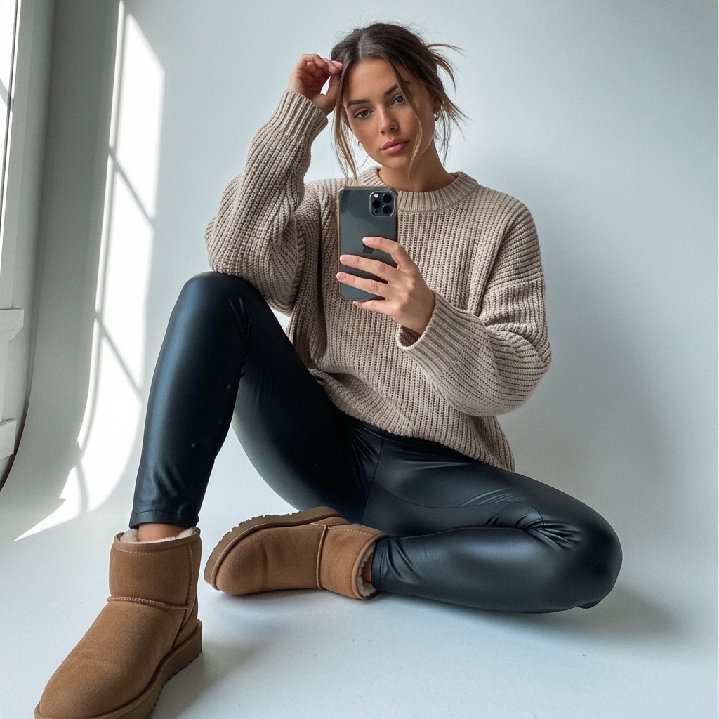 Faux leather leggings add a bold edge to the softness of Uggs. Pair with an oversized sweater or hoodie to balance textures and keep it cozy. This mix of sleek and relaxed creates a stylish yet comfortable fall outfit. Choose neutral Uggs to tone down the shine or bold colors for contrast. Perfect for a chic errand day or a casual night out.
