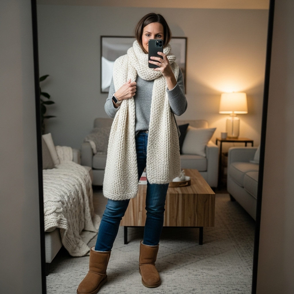 A chunky knit scarf paired with Uggs instantly elevates any fall outfit. Layer it over a simple tee, cardigan, or jacket with leggings for warmth and texture. Stick to earthy fall tones like beige, taupe, or cream for a timeless feel. The oversized scarf adds coziness while drawing attention upward, balancing the look. This is a great go-to for chilly coffee runs.