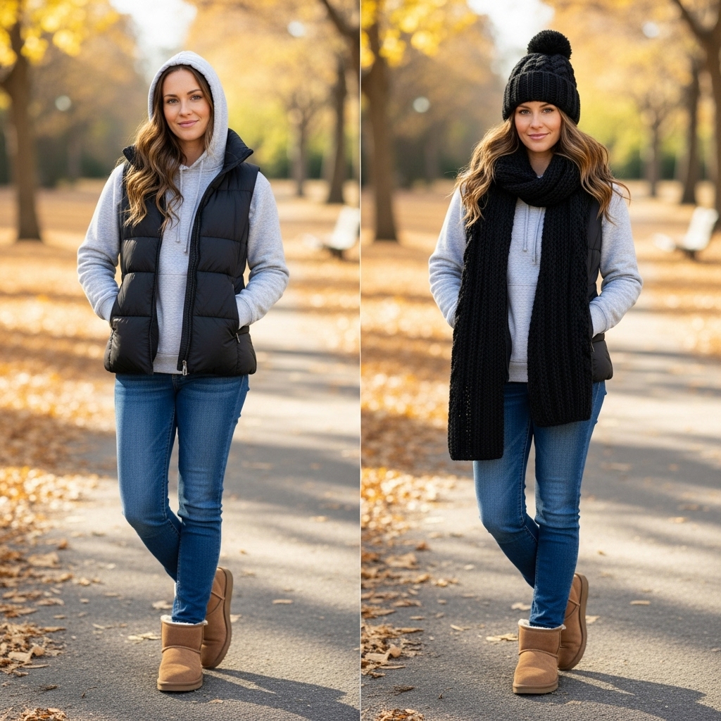 A puffer vest styled with Uggs creates a practical yet stylish fall outfit. Layer it over a hoodie or long-sleeve top with leggings for warmth without bulk. Neutral vests like black or beige look versatile, while bold colors make the Uggs stand out. Add a beanie for extra seasonal flair. This casual layered outfit works perfectly for transitional fall weather days.