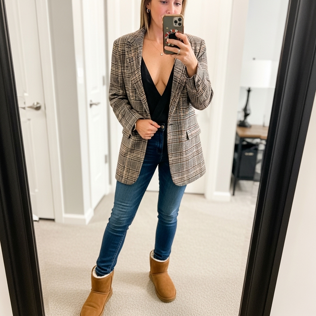 Mixing an oversized blazer with Uggs creates a trendy high-low outfit. Pair it with leggings or skinny jeans and a simple tee for balance. The structured blazer elevates the relaxed boots, making it a chic and unexpected combination. Stick to neutral blazers for versatility, or choose plaid for a fall twist. This outfit blends professional vibes with cozy comfort, perfect for city strolls.