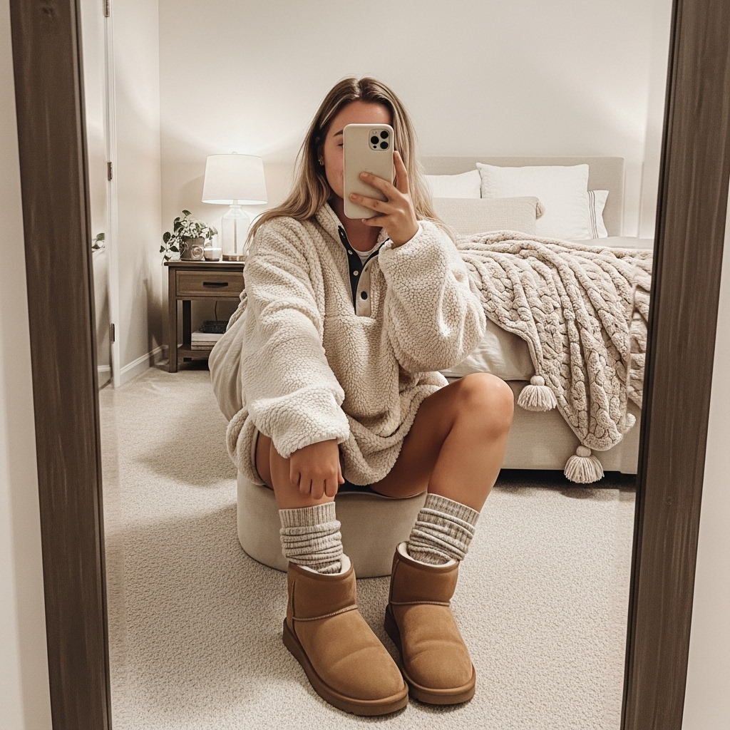 For ultimate coziness, pair a sherpa pullover with Uggs. This fuzzy-on-fuzzy combo creates a warm and inviting look ideal for cold autumn days. Balance the textures with simple leggings or fitted joggers. Go for a half-zip sherpa in neutral tones and accessorize with a beanie for a polished yet relaxed feel. It’s an outfit that feels like a warm hug while looking fashionable.