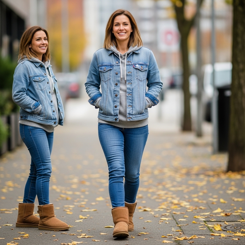 Layering a denim jacket over basics like leggings or a hoodie and pairing it with Uggs creates a casual-cool outfit perfect for fall. The mix of textures adds dimension, while Uggs keep the look grounded and cozy. Choose a light wash for a casual vibe or dark wash for a more polished look. This outfit is ideal for transitional weather when layering is key.