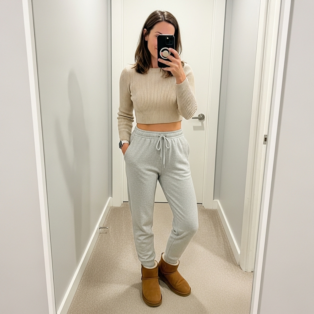 Joggers paired with a crop top and Uggs create an effortlessly stylish athleisure outfit. Add a bomber jacket or oversized cardigan to complete the look. Neutral joggers paired with tan Uggs make the outfit versatile, while colored joggers add playful energy. The cropped silhouette balances the relaxed bottoms, making it flattering and cozy. It’s a go-to option for casual meetups and weekend lounging.