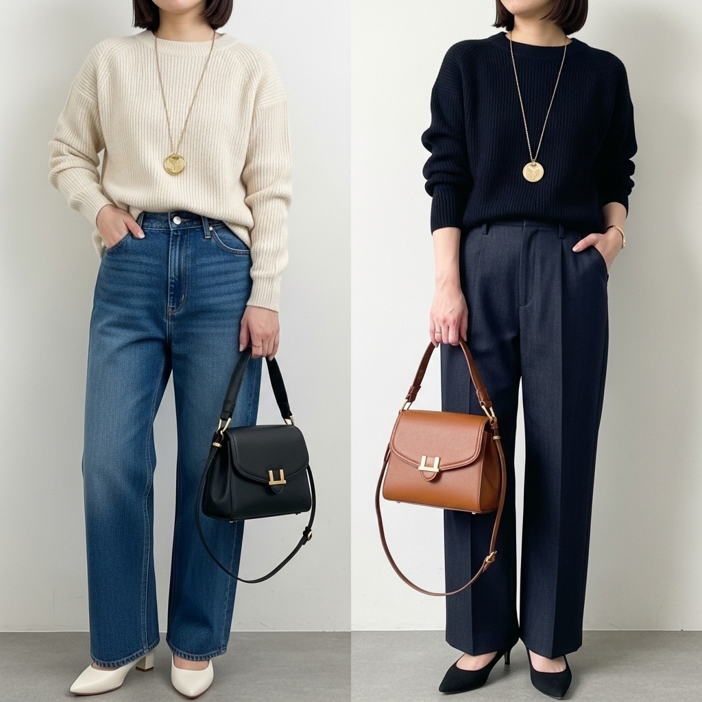 - Balance proportions by pairing oversized tops with slim bottoms.