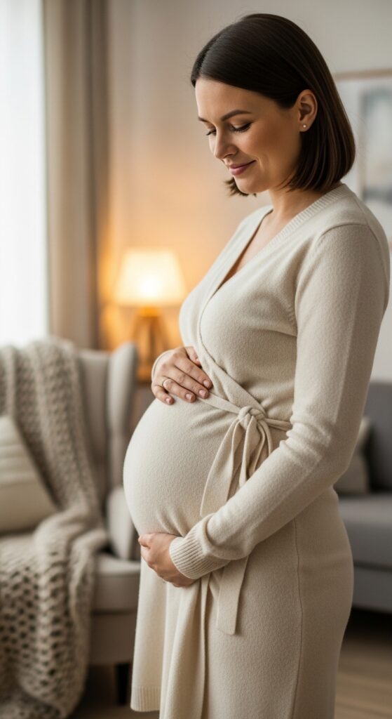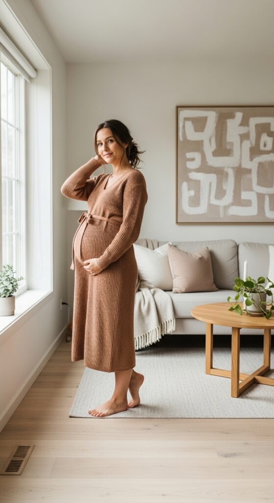 Wrap dresses work beautifully during pregnancy and can be styled with boots or heels for dressier occasions.