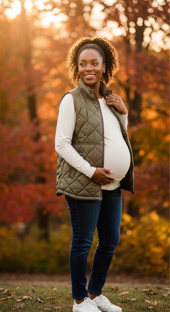 Stay warm without overheating—throw on a puffer vest with a long-sleeve tee and maternity jeans.