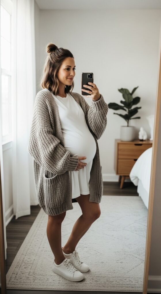 A simple maternity tee under an oversized cardigan with sneakers makes for an effortless fall outfit.