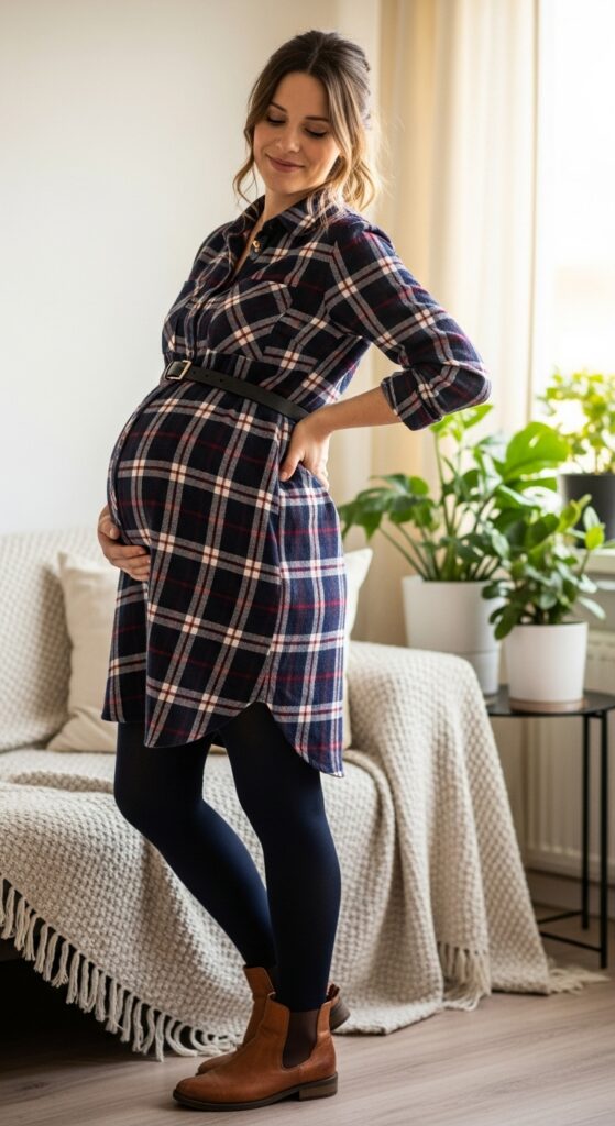 Cinch your bump with a soft belt over a plaid flannel shirt dress. Add tights and boots for a timeless fall vibe.