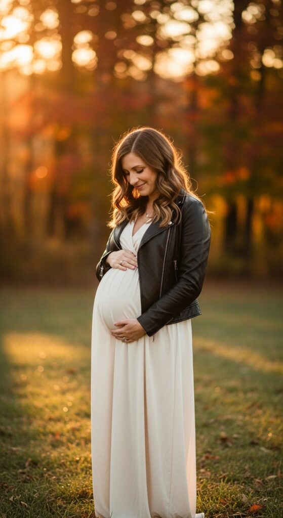 Flowy maternity maxi dresses paired with a leather jacket add an edgy yet feminine touch.