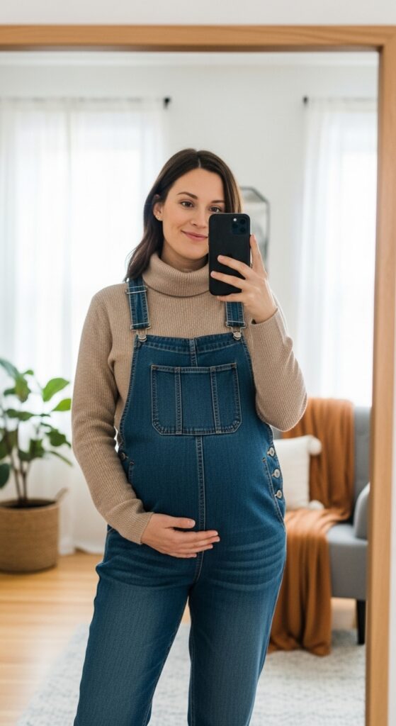 A fitted turtleneck layered under maternity overalls is cozy, cute, and Instagram-ready.