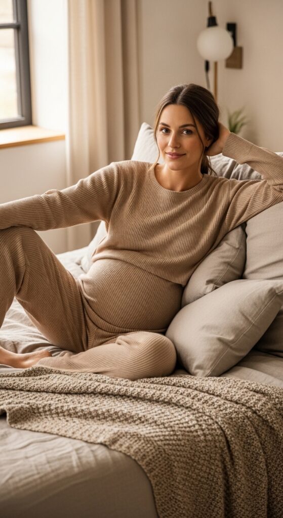 Matching ribbed maternity sets are trending—stylish and comfy, plus they look amazing with sneakers or boots.