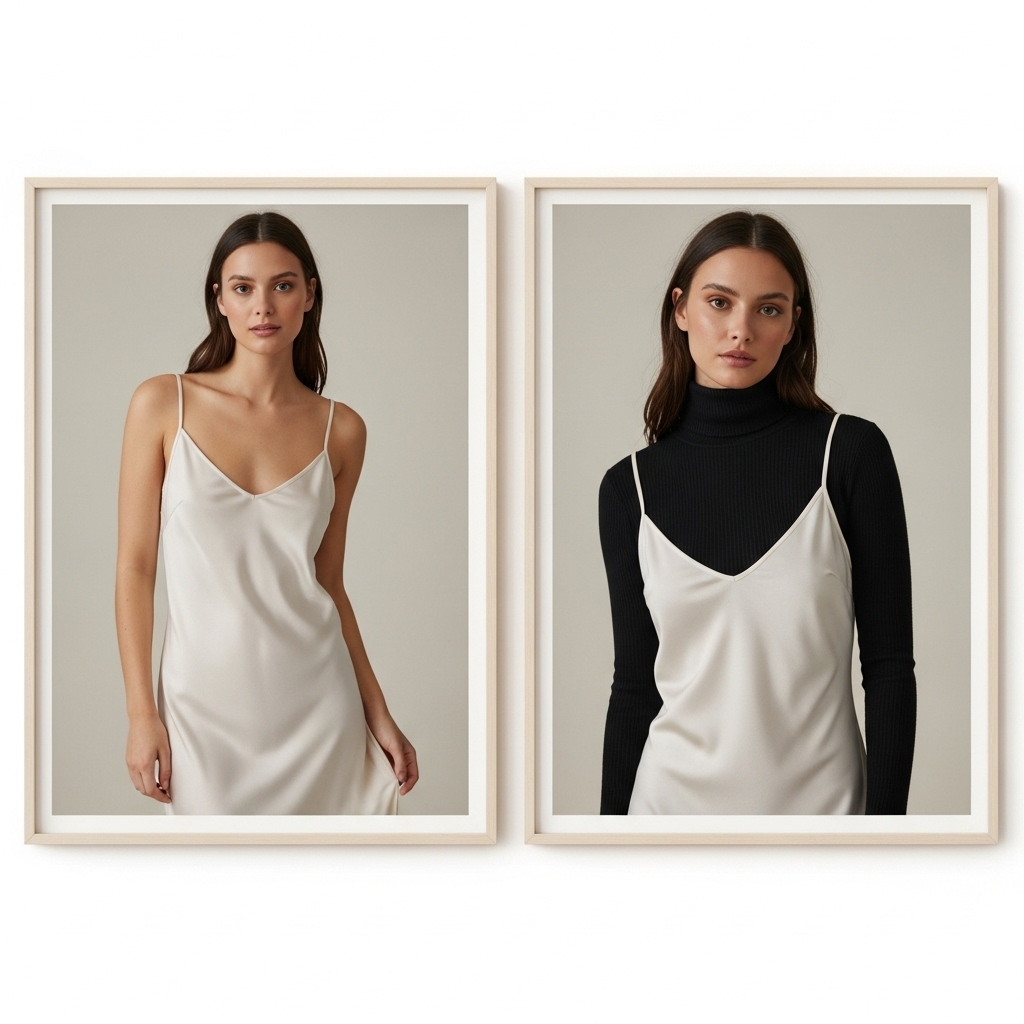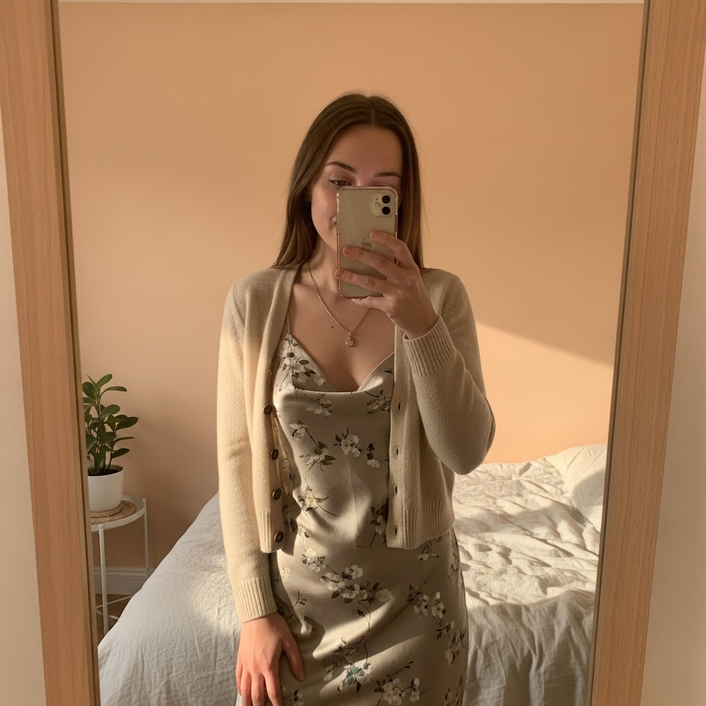 Slip dresses aren’t just for summer. Add a lightweight knit cardigan in neutral tones and ankle boots to transition this staple into fall. For chillier mornings, throw on a scarf for texture and warmth. This look strikes the perfect balance between flirty and cozy, making it ideal for brunches or casual outings in early autumn.