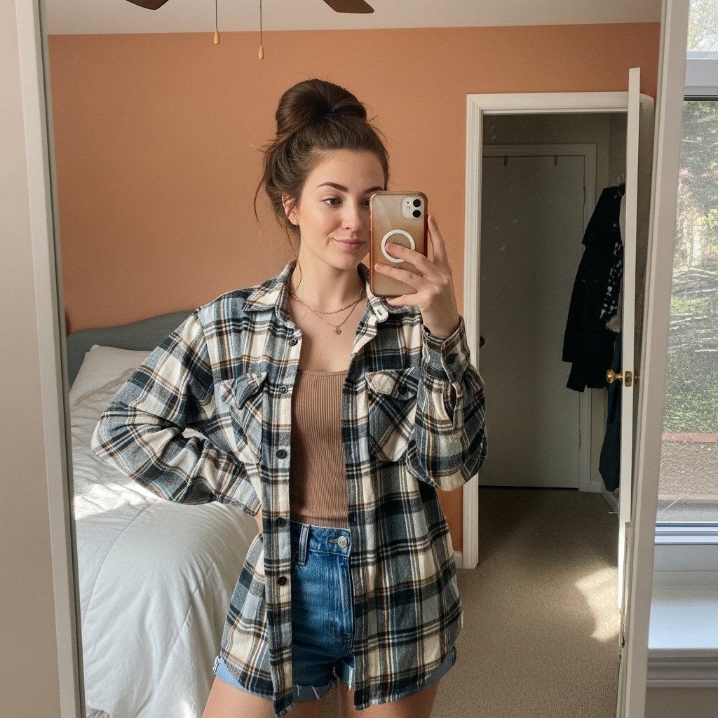Flannel shirts are fall classics for a reason. Wear yours unbuttoned over a ribbed tank top and pair with jeans or shorts. It’s a simple, versatile outfit that works for mild fall days. Add a beanie or layered jewelry for an extra seasonal touch.