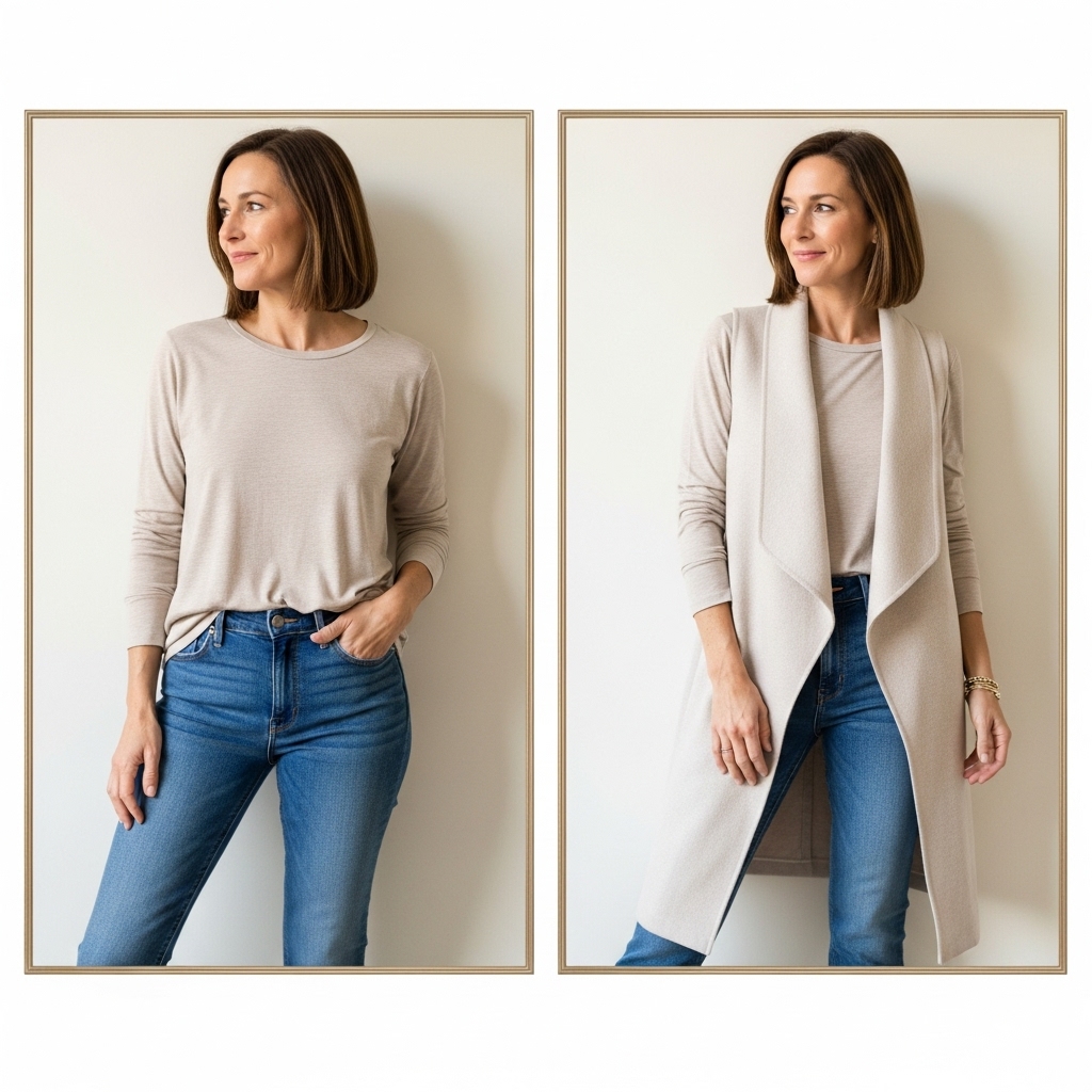 Swap your heavy coat for a longline vest during the fall transition. It adds warmth without bulk. Layer it over a long-sleeve top and jeans for an effortlessly chic outfit. Complete the look with ankle boots or sneakers — perfect for an elevated casual vibe.