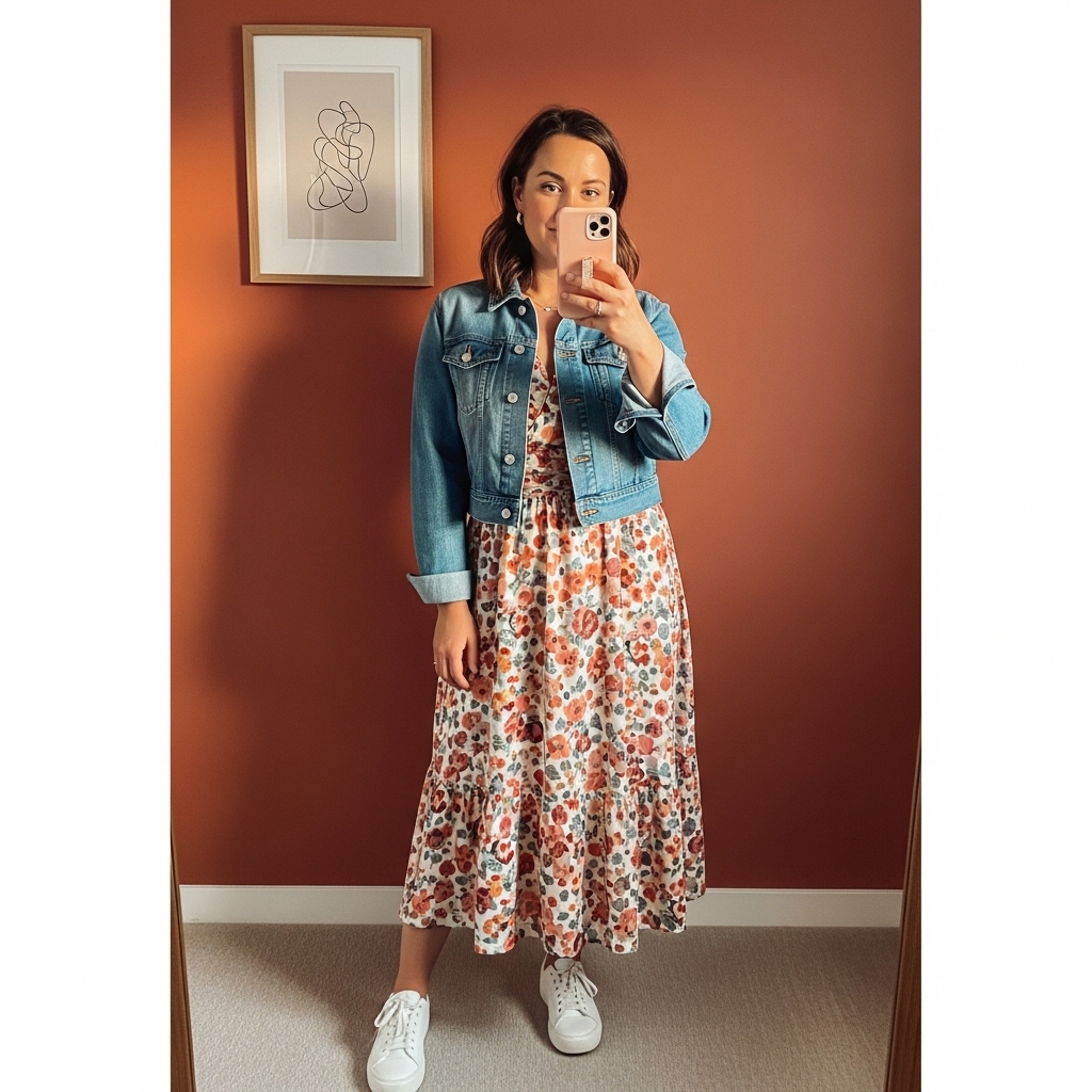 A floral midi dress layered under a classic denim jacket instantly screams “fall-ready.” It’s feminine yet practical. Pair with sneakers or heeled booties for versatile styling. The denim adds structure, while the floral print keeps things playful — a go-to combo when mornings are cool, but afternoons are warm.