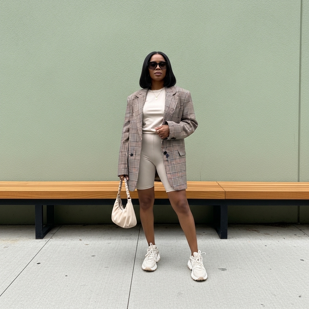 This modern street-style combo blends summer comfort with fall polish. Throw an oversized plaid blazer over neutral bike shorts and a fitted tee. Add chunky sneakers for a cool-girl vibe. It’s perfect for city strolls, coffee runs, or transitional days when you want comfort and edge in equal measure.