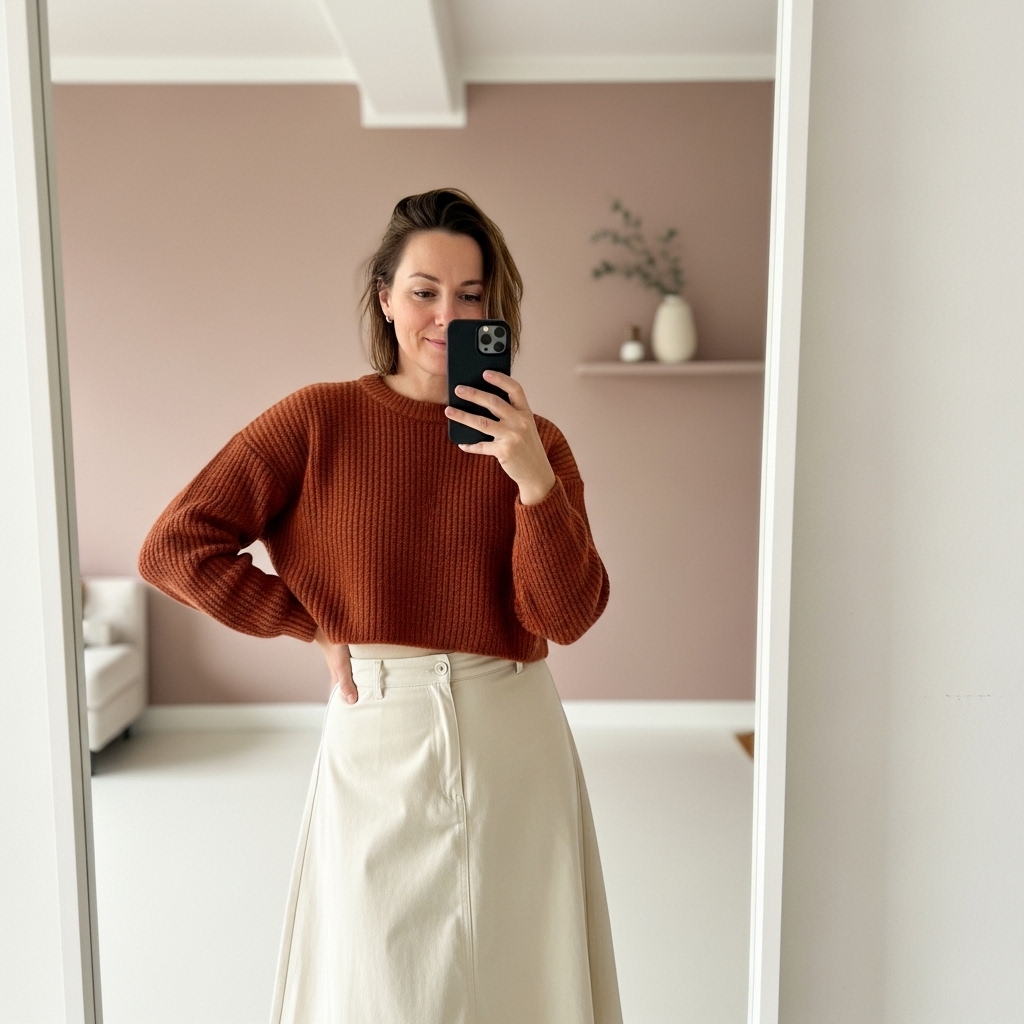 When you’re not ready to give up skirts, pair your high-waisted mini or midi with a cropped knit sweater. Choose fall shades like rust, mustard, or olive. The cropped silhouette keeps the outfit breathable while the knit texture adds warmth — perfect for date nights or weekend outings.