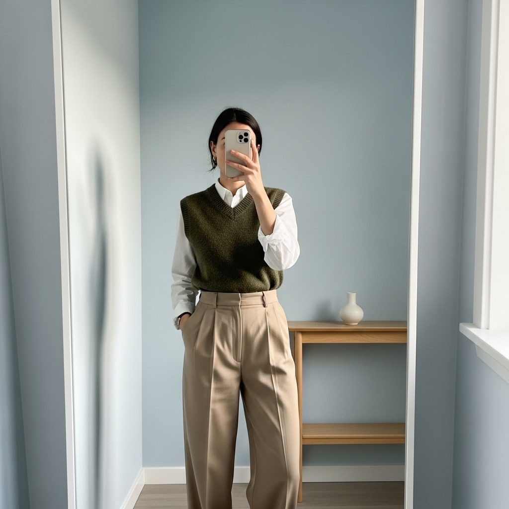 Vests are trending this season. Pair a knitted vest over a crisp white shirt and wide-leg trousers. It’s preppy, polished, and breathable — just right for the unpredictable fall weather. Finish the look with loafers or ankle boots for that refined “off-duty academic” aesthetic.